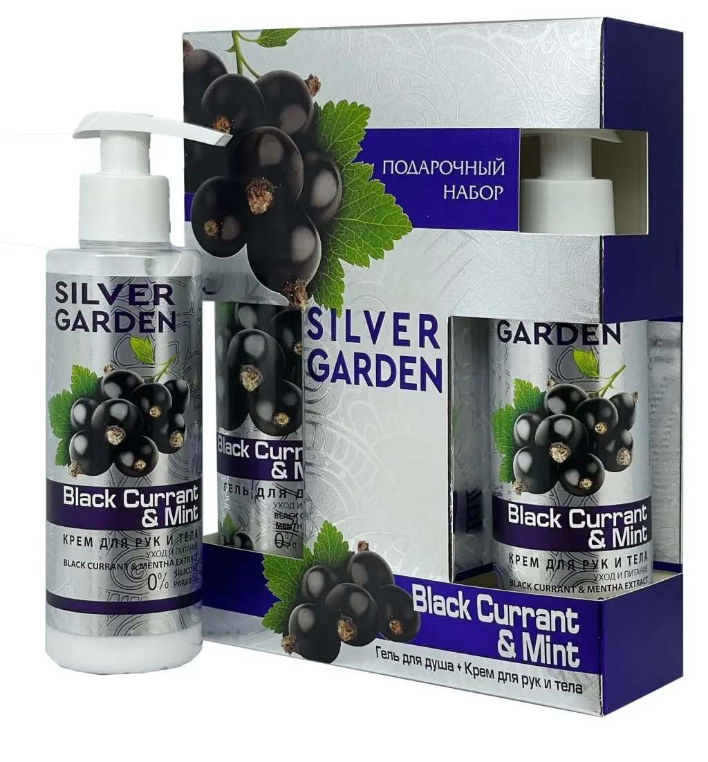 SILVER GARDEN ЧЕРНАЯ СМОРОДИНА И МЯТА подарочный набор для женщин упакован в яркую и красивую подарочную коробку и состоит из крема для рук и тела 200 мл и геля для душа 250 мл, в состав которых входит натуральные экстракты - Ribes Nigrum (Black Currant) Leaf Juice и Mentha Arvensis Leaf Extract. Экстракт черной смородины хорошо питает кожу, предупреждает развитие купероза и сосудистых звездочек, обладает отшелушивающим действием, что способствует укреплению и регенерации кожи. Экстракт мяты оказывает на кожу успокаивающее действие, снимает раздражение и усталость, хорошо освежает.Мягкий крем для рук и тела Черная смородина и мята обеспечивает роскошный уход за кожей на целый день. Интенсивно питает, смягчает и увлажняет кожу, придавая ее эластичность и приятный аромат. Кожа становится нежной и бархатистой.Формула геля позволяет мягко и бережно очищать кожу, восстанавливая естественный уровень влажности. Экстракты черной смородины и мяты способствуют дополнительному уходу и питанию кожи. Появляется ощущение мягкости, чистоты и комфорта.