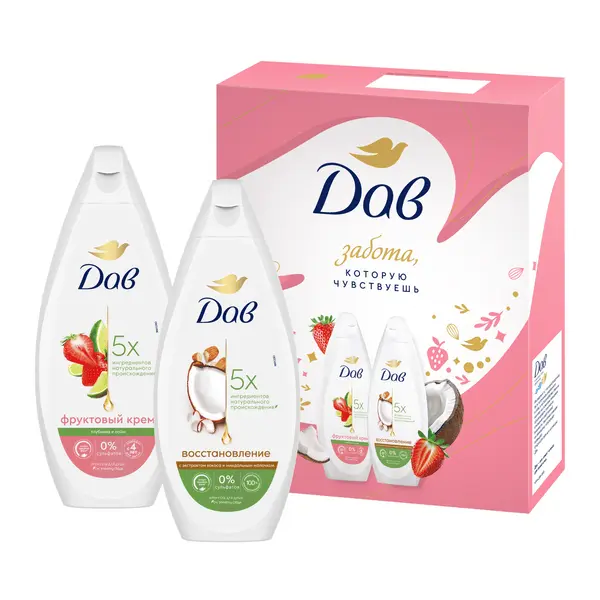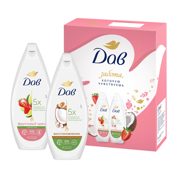 Дав Подарочный набор уходовой косметики для женщин Фруктовое настроение – это отличный выбор для презента на любой праздник и просто так. Если вы не знаете, какой сюрприз преподнести своей знакомой или подруге, то присмотритесь к этому набору уходовых средств. В комплект входят два геля для душа: с ароматом клубники и лайма и с ароматом кокоса и миндаля. Крем-гель для душа с клубникой разработан на основе ухаживающей формулы с 5-ю ингредиентами натурального происхождения. Гель для душа ароматизированный обогащен бетаином, натуральными маслами отдушки, стеариновой кислотой, глицерином и пребиотиками. Гель для душа Фруктовый крем увлажняет и смягчает кожу всего за 1 применение*. Средство бережно относится к микробиому кожи. Бессульфатный гель для душа на ¼ состоит из фруктового крема. Гель для душа увлажняющий женский имеет аромат сочной клубники с нотками мяты, цветов и бодрящего лайма на основе мускусной базы. Крем-гель для душа женский разработан на основе 95% биоразлагаемой формулы**. Гель-крем для душа Ритуал красоты восстановление имеет приятный аромат кокоса и миндаля. Продукт содержит бетаин, экстракт кокоса, стеариновую кислоту, глицерин и пребиотики. Бетаин мягко очищает кожу, а экстракт кокоса насыщает ее витаминами. Стеариновая кислота питает кожу, а глицерин ее увлажняет.