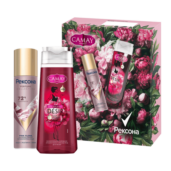 Рексона + Camay Подарочный набор уходовой косметики для женщин – это отличный выбор для презента на любой праздник и просто так. Если вы не знаете, какой сюрприз преподнести своей знакомой, подруге или родственнице, то обязательно присмотритесь к этому набору уходовых средств. В комплект входят два эффективных продукта: гель для душа парфюмированный и дезодорант-антиперспирант женский спрей. Camay гель для душа женский парфюмированный ВОСХИТИТЕЛЬНОЕ ОЧАРОВАНИЕ имеет состав, обогащенный цветочными маслами: лаванды, иланг-иланга и душицы. Камей гель для душа ароматизированный имеет стойкий аромат пиона и красных ягод, который сохраняется на коже до 8 часов*. Наши эксперты вдохновились феноменально** популярным парфюмом Baccarat rouge 540. Так появился парфюмированный гель для душа женский Camay. Пион, османтус и фрезия представляют собой верхние ноты парфюма, плавно переходящие в сердце композиции – сочные красные ягоды (вишня и клубника). Завершающие акценты обволакивающего кашемира и белого кедра стали шлейфом, послевкусием данного аромата. Дезик женский спрей PINK FLORA защищает от пота и запаха в течение 72 часов***. Женский парфюмированный дезодорант разработан на основе революционной' технологии со специальными' микрочастицами. Для нон-стоп защиты от пота микрочастицы образуют дышащую микропленку на поверхности кожи в момент выделения пота, а микрокапсулы – раскрываются во время движения под действием трения, непрерывно высвобождая дополнительный аромат. Дезодорант-спрей женский имеет невероятно романтичный запах. Аромат раскрывается сочными нотками малины, личи и мандарина, переходящими в аккорды смородины, перца и пионов с мускусной базой.