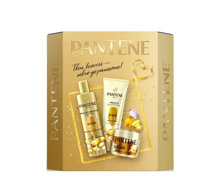 Pantene, Подарочный набор Pro V Miracle Маска 300+Шампунь 250 Pro V Miracle+Сыворотка Ополаскиватель 200 Pro V Miracle Интенсивное восcтановление, 2 упаковки. Для пошагового ухода за волосами. В набор входят три средства для ежедневного применения: шампунь для волос 250 мл, сыворотка для волос 4в1 200 мл и маска 300 мл из коллекции Интенсивное Восстановление. Шампунь Pantene Pro-V Miracle сыворотка Интенсивное восстановление с пептидами коллагена идеально подходит для сильно поврежденных волос. Благодаря уникальному комплексу Pro-V шампунь мягко очищает волосы и обеспечивает им превосходное питание, восстанавливая повреждения от укладки. Питательная сыворотка-кондиционер 4в1 для глубокого восстановления поврежденных и ослабленных волос. Комплекс Pro-V, обогащенный укрепляющими липидами, защитными антиоксидантами и коллагеном. Кондиционирующая сыворотка для волос с тающей текстурой проникает глубоко в структуру волос и дарит им в 3 раза больше силы изнутри. Формула интенсивного ухода помогает устранить видимые повреждения за 1 применение, не утяжеляя волосы.