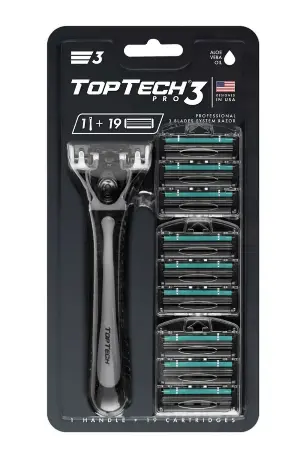 Особенности модели TopTech Pro 3: Лезвия TopTech изготовлены на высокотехнологичном автоматизированном производстве из стали марки Sandvik. Сталь лезвий TopTech закаляется азотом при низких температурах до -80 °C. Это позволяет достичь улучшенных характеристик режущей кромки каждого лезвия и максимально увеличивает срок службы одной сменной кассеты.