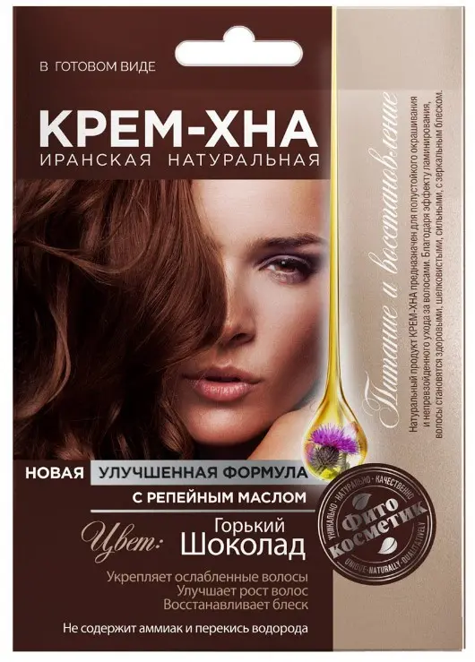 Инновационный прорыв в сфере окрашивания волос. Это натуральная природная краска, обогащенная репейным маслом, дарит волосам глубокий, сияющий цвет «ГОРЬКИЙ ШОКОЛАД», интенсивно питает, увлажняет, восстанавливает и оздоравливает их. Наполняет жизненной силой и энергией от корней до кончиков волос, придает ослепительный блеск и объем. Репейное масло усиливает капиллярное кровообращение в коже головы, питает и укрепляет корни и структуру волос. После использования крем-хны в готовом виде, волосы приобретают красивый насыщенный цвет, становятся более густыми, эластичными, упругими и шелковистыми и послушными.