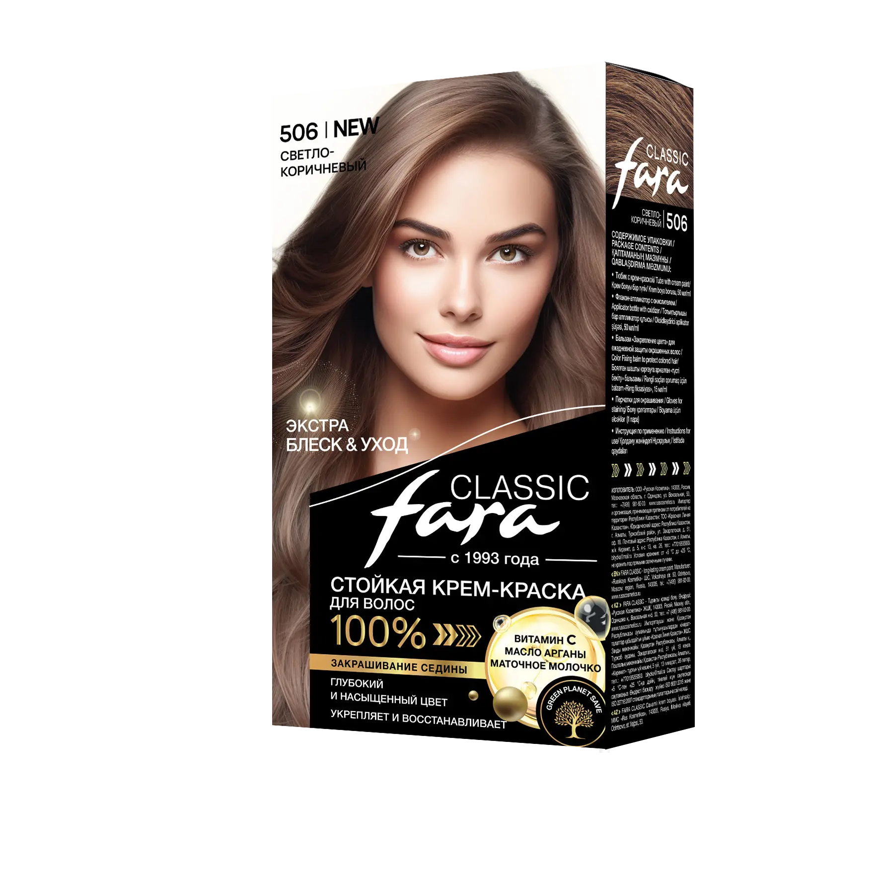 Краска для волос Fara Classic 506 мягко окрашивает, придавая волосам стойкий насыщенный цвет. Fara Classic 506 – отличный выбор для девушек с темной и загорелой кожей, а также карими, зелеными и голубыми глазами. Он выглядит натурально и замечательно подчеркивает общий образ. Насыщенный коричневый цвет гармонирует и с длинными, и с короткими волосами, придавая им объем и красивый блеск.