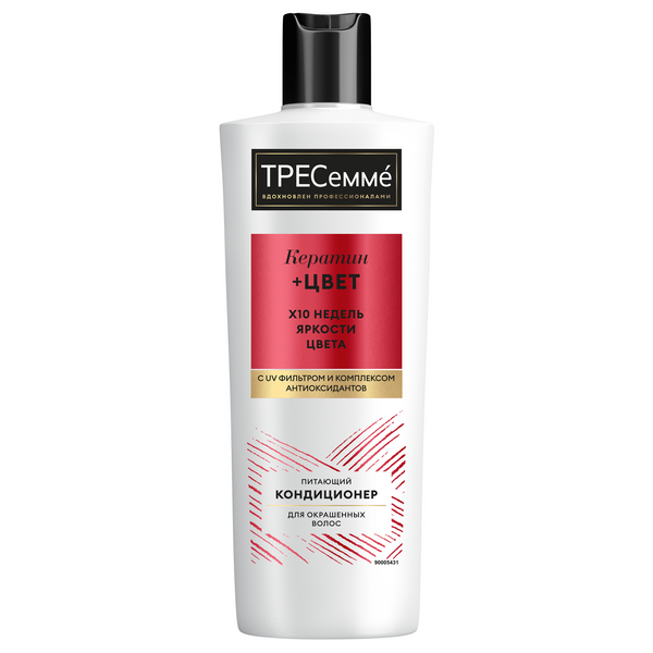TRESemmé Keratin COLOR — кондиционер для окрашенных волос, вдохновленный профессиональными уходовыми средствами. Питающий кондиционер для волос женский с UV фильтром и комплексом антиоксидантов’ дарит видимый результат — X10 недель яркости цвета’’! Верните жизнь окрашенным локонам и подчеркните их красоту вместе с уходом за волосами от TRESemmé: - Особая формула’’’ кондиционера запечатывает волос в невидимый защитный слой, который защищает цвет и позволяет сохранить яркий, живой оттенок. - Средство облегчает расчесывание, сглаживает неровности и делает волосы послушными. - Кондиционер для волос окрашенных оказывает питающее действие, придает мягкость и сияющий блеск. Уход для волос из коллекции Keratin COLOR оптимально подходит для окрашенных волос, которые потеряли жизненную силу и выглядят тусклыми. Также кондиционер подарит дополнительное питание для нормальных волос, склонных к спутыванию и ломкости.