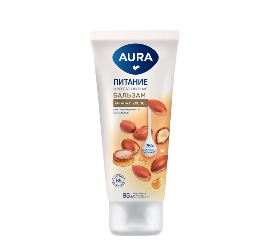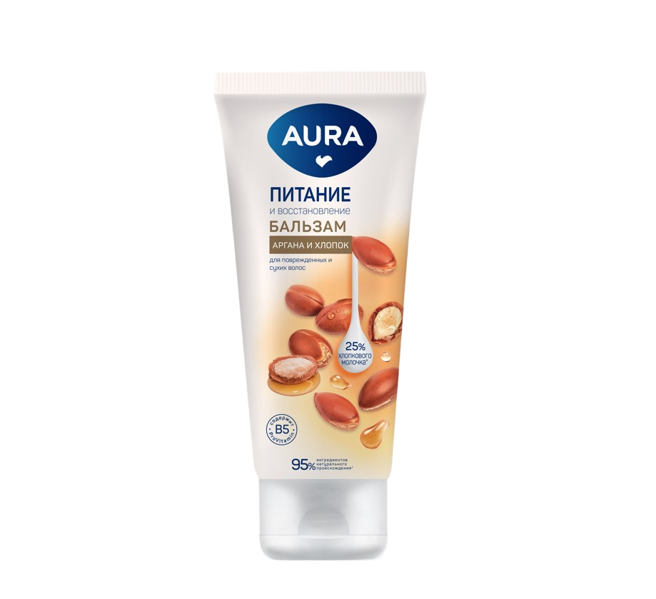 Бальзам AURA Питание и восстановление предназначен для ухода за поврежденными и ослабленными волосами, нуждающихся в интенсивном уходе. Выравнивает структуру волос, делает их блестящими и шелковистыми, облегчает расчесывание. Глубоко проникает в структуру волос, питает и восстанавливает их по всей длине без утяжеления. МАСЛО АРГАНЫ увлажняет, смягчает и питает каждый волосок, предупреждает появление секущихся кончиков. ПРОВИТАМИН В5 восстанавливает поврежденную структуру волос, глубоко питает и разглаживает их. ХЛОПКОВОЕ МОЛОЧКО легко проникает в структуру волос, нежно ухаживает за ними и придает особую мягкость и блеск. Бальзам на 95% состоит из ингредиентов натурального происхождения. Благодаря АКТИВНОЙ ФОРМУЛЕ ТРОЙНОГО УХОДА волосы восстанавливаются и приобретают здоровый внешний вид при его регулярном использовании. Для наилучшего эффекта рекомендуем использовать вместе с шампунем AURA Питание и восстановление.