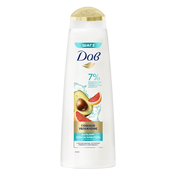 Бальзам-ополаскиватель для женских волос Дав Глубокое увлажнение – это эффективное очищающее средство для локонов с гиалуроновой кислотой. Новая серия продуктов для волос Дав c уникальной двойной формулой для глубокого увлажнения и сохранения естественного объема локонов. Кондиционер для волос из новой серии следует соблюдать в прядях и включать расчесывание. Средство подходит для всех типов волос, особенно для волос. Увлажняющий бальзам для волос имеет состав, обогащенный активными ингредиентами. Продукт содержит 7% увлажняющей сыворотки с гиалуроновой кислотой, маслом авокадо, экстрактом грейпфрута и витамином С. Бальзам с гиалуроновой кислотой наполняет стержень волос влагой, обеспечивая коже глубокое увлажнение. Уходовое средство с ароматом грейпфрута, тонкими волосами, яркостью и упругостью, сохраняя объем. За счет особой формулы с маслом авокадо, экстрактом грейпфрута и витамином С бальзамом, мягкостью и естественным блеском волос. Результат: глубоко увлажненные волосы.
