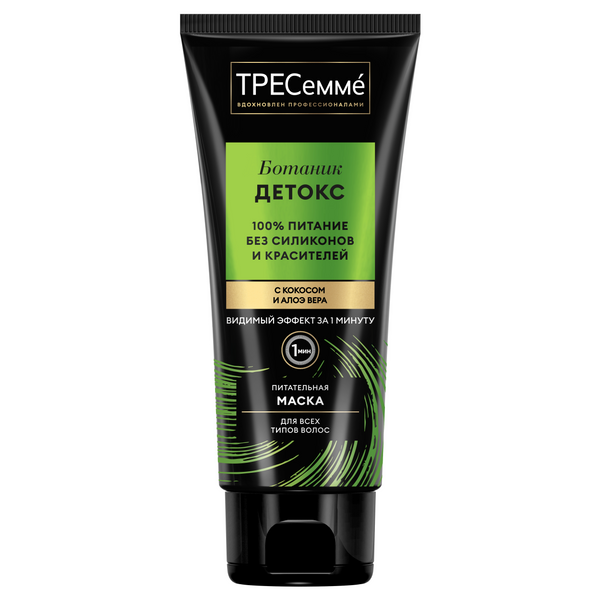 Твои волосы нуждаются в питании и увлажнении? Хочешь иметь гладкие и мягкие волосы? Теперь это возможно с новой экстрапитательной* маской TRESemmé из серииBotanique Detox, вдохновленной природой! Без силиконов, парабенов и красителей. Формула с кокосом и алоэ вера увлажняет волосы и наполняет питательными компонентами. • 'Обеспечивает глубокое' увлажнение и питание; • Оставляет ощущение мягкости и разглаживает волосы; • Легкая текстура не утяжеляет волосы, сохраняя их свежесть и подвижность. Попробуй все три способа применения маски. Как кондиционер: нанеси на вымытые влажные волосы, смой. В качестве маски: нанеси на вымытые влажные волосы, оставь на 3-5 минут, смой. И как несмываемый уход: нанеси на кончики вымытых влажных волос тонким слоем, не смывай. Подходит для регулярного использования. Всего три шага на пути к безупречному образу и роскошным волосам. Начни с шампуня для качественного и бережного очищения.