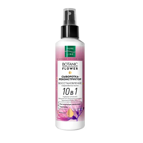 Частые укладки и мытье волос жесткой водой делают их безжизненными и тусклыми? Добавьте в свой ежедневный уход серию Реконструкция и защита Pure Line от бренда Чистая Линия. Сыворотка-реконструктор – это завершающий этап в уходе за волосами и надежная защита. Она действует как увлажняющая термозащита для волос, восстанавливает структуру волос после воздействия на них жесткой воды. • Несмываемый спрей для волос содержит эфирные масла и пантенол, защищает волосы от повреждений, сухости и перепада температур. • Растительные керамиды восстанавливают волосы по всей длине, придавая им упругость и здоровый блеск. • За 3 применения восстанавливает структуру волос°. Сыворотка 10 в 1 обеспечивает видимый результат*: Во-первых, активное восстановление – если ваши волосы будут подвергаться интенсивному воздействию, сыворотка компенсирует его последствия. Во-вторых, ультраукрепление' – волосы станут прочными и упругими. В-третьих, термозащита до 230°C – больше не нужно беспокоиться о воздействии высокой температуры во время укладки. В-четвертых, средство обеспечит защиту от ломкости и секущихся кончиков. Несмываемая сыворотка также интенсивно питает ваши волосы, увеличивает их плотность и объем, не утяжеляя их. Благодаря быстрому впитыванию, вы получите блеск и гладкость волос уже после первого применения. Действует как увлажняющий термоспрей.