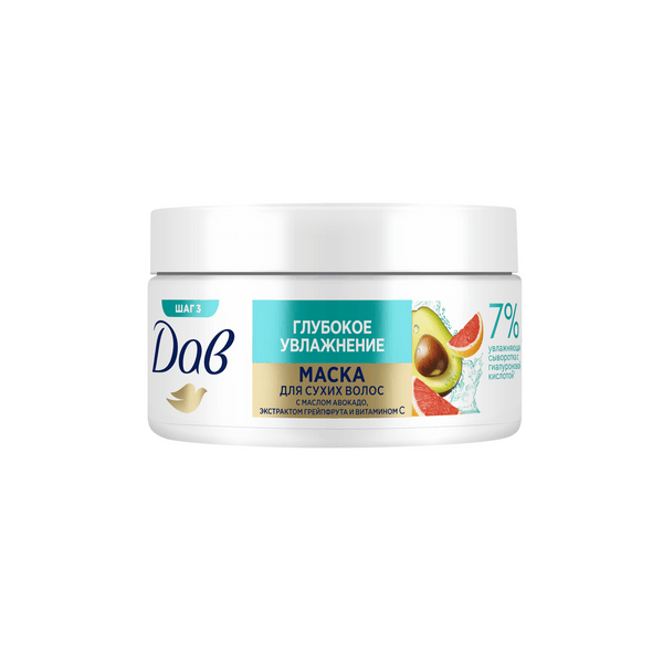 Маска для волос Дав Глубокое увлажнение – это эффективное ухаживающее средство для локонов с гиалуроновой кислотой. Новая серия продуктов для волос Дав c уникальной двойной формулой для глубокого увлажнения и сохранения естественного объема локонов. Маска для волос увлажняющая из новой серии Дав питает локоны, делая их более послушными. Средство подходит для всех типов волос, особенно для волос. Маска имеет состав, обогащенный активными ингредиентами. Продукт содержит 7% увлажняющей сыворотки с гиалуроновой кислотой, маслом авокадо, экстрактом грейпфрута и витамином С. Уходовое средство увлажняет стержень волос, обеспечивая глубокое увлажнение. Питательная маска для волос с тонкими локонами придает блеск и упругость, сохраняя объем. За счет особой формулы с маслом авокадо, экстрактом грейпфрута и витамином для кожи, тонкими волосами, мягкостью и естественным блеском. Результат: глубоко увлажненные волосы.