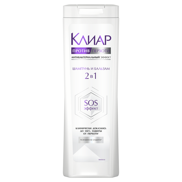 Шампунь и бальзам для волос от перхоти Клиар Антибактериальный эффект 2в1 - это эффективное средство для ухода за волосами и кожей головы у мужчин и женщин, страдающих от проблем повышенной жирности локонов и проявлений перхоти. Шампунь для волос мужской и женский является SOS средством против перхоти' с самой эффективной защитой'' для здорового внешнего вида кожи головы и волос. Новая гелевая формула средства с тройной технологией защиты обеспечивает избавление от видимой перхоти при регулярном использовании. Питательный шампунь против перхоти обогащен пироктон оламином в концентрации Х2''', который до 100% защищает от перхоти', зуда и шелушения*. Косметический уходовый продукт содержит в своем составе аминокислоты (глицин и таурин), витамин В3. Эти компоненты оказывают питание кожи головы и локонов без пересушивания от корней до самых кончиков. Восстанавливают волосы и придают им блеск и сияние. Питательный шампунь против перхоти для женщин и мужчин Клиар 2в1 оказывает антибактериальный эффект и воздействует на основную причину возникновения перхоти с первого применения. Мужской и женский шампунь бальзам-ополаскиватель для волос клинически протестирован и подходит для ежедневного применения. Эффективное и глубокое^ очищение поддерживает свежесть и красоту локонов даже при частом использовании. Шампунь и кондиционер для волос Клиар Антибактериальный эффект 2в1 создан для мужчин и женщин, которые ценят качественную косметику для красоты и блеска своих волос. Используйте его для достижения устойчивого результата в борьбе с перхотью и жирностью кожи головы! ‘удаляет видимую перхоть при регулярном использовании.