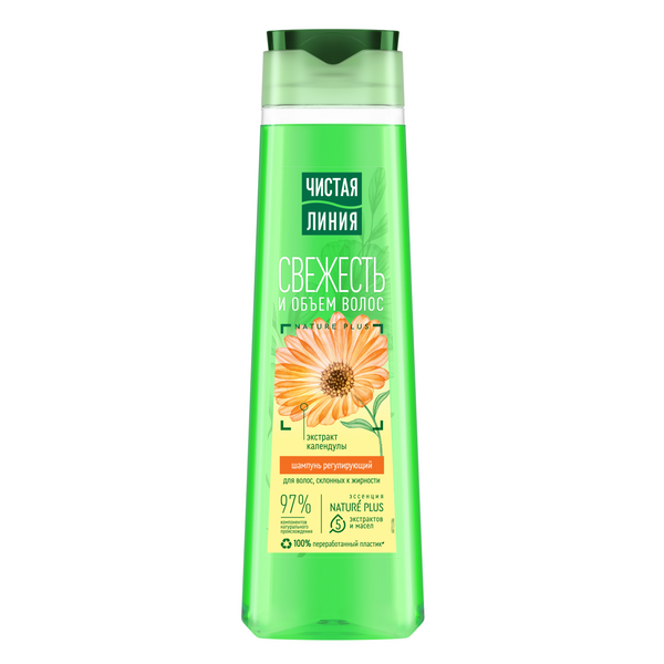 Новая формула шампуней ЧИСТАЯ ЛИНИЯ создана для видимой СИЛЫ и ГУСТОТЫ волос. Технология биоферментации делает привычные натуральные компоненты до 60 раз эффективнее. Волосы становятся плотнее и гуще по всей длине. Шампунь Регулирующий для волос, склонных к жирности с экстрактами календулы, шалфея, тысячелистника, контролирует активность сальных желез и надолго сохраняет ощущение свежести и чистоты. Активные натуральные компоненты снижают излишнюю жирность кожи головы и волос, не пересушивая корни. В календуле содержатся каротиноиды, флавоноиды (биологически активные вещества, обладающие антиоксидантными свойствами), кумарины и прочие полезные для кожи вещества. Благодаря им календула очищает, освежает, тонизирует. Шампуни и бальзамы с добавлением шалфея питают кожу головы и волосы, а также нормализуют их состояние. Регулярное применение косметических средств на основе тысячелистника помогает вернуть волосам природную мягкость и объем.