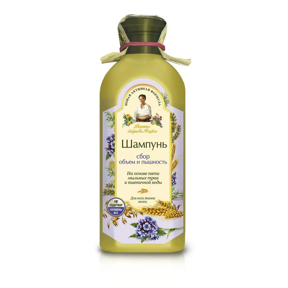 Пшеничная вода, входящая в состав шампуня, придает волосам естественный объем, а специально подобранные травы укрепляют их от корней до самых кончиков. Натуральная вспенивающая основа на пяти мыльных травах (солодка уральская, амарант, качим сибирский, белый и красный мыльные корни) мягко очищает волосы и кожу головы.