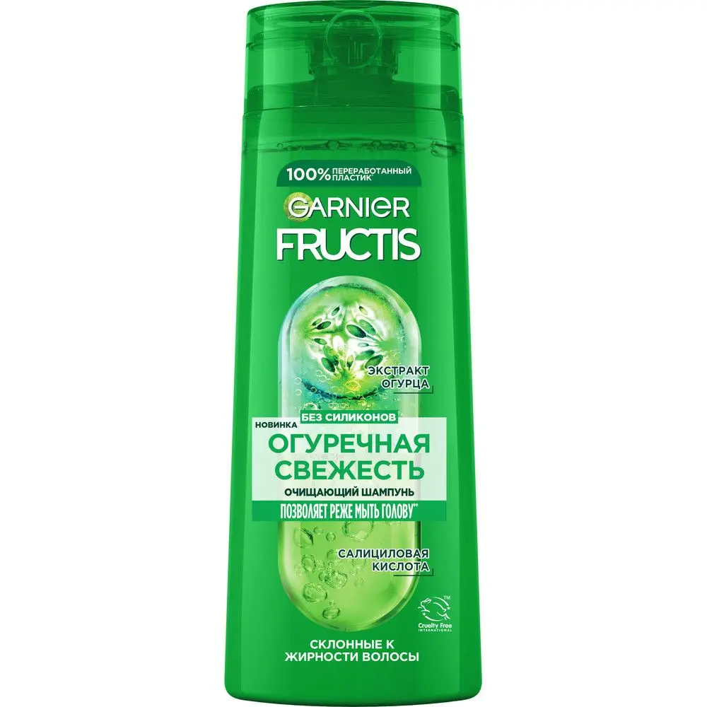 Fructis представляет систему очищения волос, которая совмещает в себе суперфрукт с активными ингредиентами. Ваши волосы выглядят здоровыми и сильными. Шампунь Огуречная Свежесть обогащен суперингредиентами: Формула с экстрактом огурца и очищающими компонентами укрепляет и очищает волосы и кожу головы. Доказано! Избыток кожного сала удален, волосы чистые, легкие от корней до кончиков. Вы можете реже мыть голову.