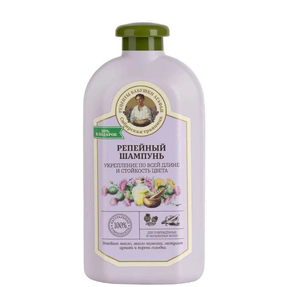 Шампунь для поврежденных и окрашенных волос РЕЦЕПТЫ БАБУШКИ АГАФЬИ Сибирская Травница Укрепление по всей длине специально создан для помощи поврежденным и окрашенным волосам. Репейное масло препятствует вымыванию пигмента из окрашенных локонов и способствует укреплению структуры. Если волосы повреждены, то без него точно не обойтись – витамины и жирные кислоты репейного масла помогут коже головы и восстановят ослабленные корни волос. Масло камелии вернет им гладкость и блеск, экстракт арники оздоровит и защитит, а корень солодки очистит и ускорит рост. Шампуню репейному удастся вернуть силу и блеск поврежденным волосам, а окрашенным помочь выглядеть здоровыми, гладкими.