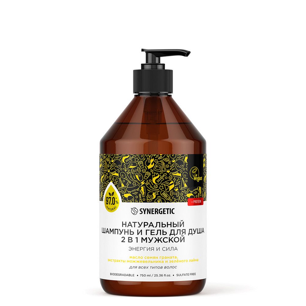 Synergetic натуральный бессульфатный шампунь и гель для душа 2 в 1 мужской энергия и сила 750 мл