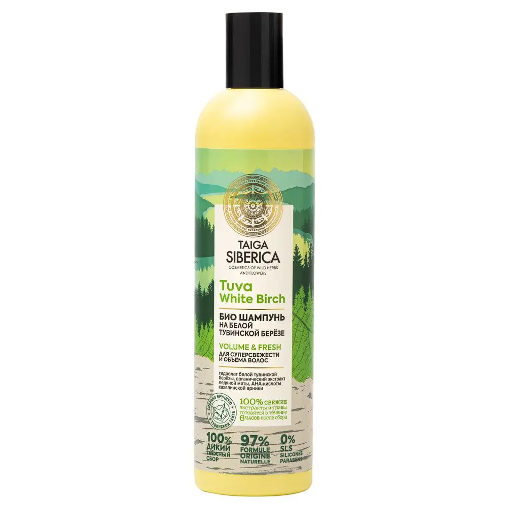 Био шампунь для супер свежести и объёма волос VOLUME & FRESH Tuva White Birch Идеальное сочетание свежести и легкости. Благодаря восстановлению оптимального баланса кожи головы и отсутствию в составе силиконов, волосы у корней сохраняют силу и упругий объем. Супер объем без утяжеления Наполняет свежестью и легкостью Укрепляет тонкие и ослабленные волосы БЕЛАЯ БЕРЕЗА — ТАЕЖНЫЙ СУПЕРФУД ДЛЯ ВОЛОС. Гидролат белой тувинской березы на 85% состоит из бетулиновой кислоты – таежного суперфуда и антиоксиданта для волос. В дикой ледяной мяте содержание эфирного масла до 5 раз выше, чем в обычной. Эффективно тонизирует и освежает кожу головы, придает волосам здоровый блеск и силу.AHA – кислоты сахалинской арники обновляют и оздоравливают кожу головы, способствуя укреплению корней и росту новых волос.