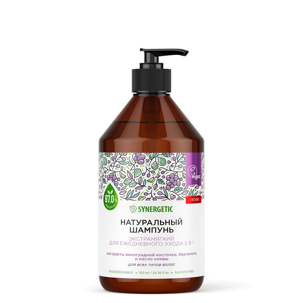 Synergetic натуральный бессульфатный шампунь экстрамягкий для ежедневного ухода 2 в1 750 мл
