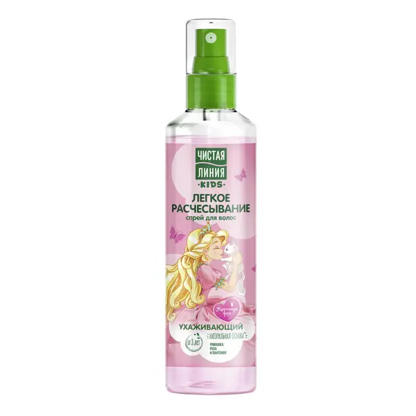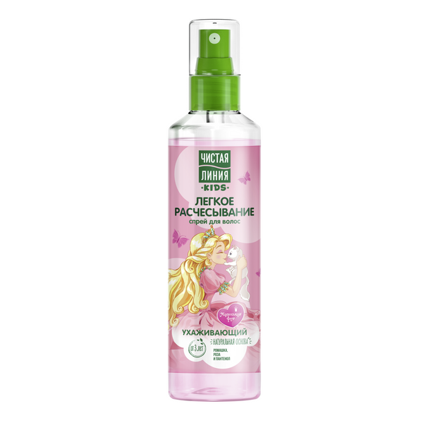 Специально для детских волос, в том числе склонных к спутыванию, эксперты бренда Чистая Линия разработали спрей Легкое расчесывание. • Имеет натуральную основу° и содержит природный кондиционер для волос. • Масляный экстракт ромашки способствует росту волос и их укреплению. • Экстракт лепестков розы увлажняет волосы и придает блеск. • Пантенол смягчает и разглаживает волосы. • После применения спрея для волос расчесывание становится в два раза легче1! Подходит для ежедневного применения, как на влажных, так и на сухих волосах. Рекомендован для детей от 3-х лет. Идеально использовать с шампунем-бальзамом Чистая Линия Шелковистые локоны. Спрей имеет приятный аромат и наверняка придется по душе маленьким модникам и модницам.