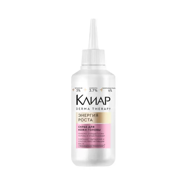 Чтобы восстановить тонкие, ослабленные и склонные к выпадению волосы, попробуйте продукты серии Derma Therapy Энергия роста. 1-2 раза в неделю перед мытьем волос шампунем серии, нанесите скраб по проборам на кожу головы, помассируйте пару минут и смойте. Продукт легко нанести и смыть, благодаря пенящейся формуле. Формула скраба с 3.7% коллагена² и 3% витамина В3² увлажняет и укрепляет волосы от корней¹. 4% Минеральные гранулы бережно очищают и отшелушивают.