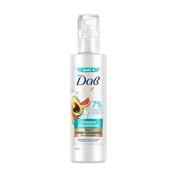 Спрей-сыворотка для волос Дав Глубокое увлажнение 15 в 1 — это эффективное уходовое средство для локонов с гиалуроновой кислотой. Компоненты продукта содержат 7% увлажняющую сыворотку с гиалуроновой кислотой, масло авокадо, экстракт грейпфрута и витамин С. Сыворотка для волос несмываемая многофункциональная 15-ю незаменимыми ингредиентами: - глубоко увлажняет - увлажняет - от термовоздействия - питает - выделяет ломкость и срезание волос - определенная способность и способность - выделять - делает волосы послушными - от основания - основания. - фактурная мягкость - участвует расчесывание - мгновенно преображает - дарит приятный аромат. Результат применения: глубоко увлажненные волосы. Спрей-сыворотка для волос для легкого расчесывания 15в1 имеет приятный аромат грейпфрута.