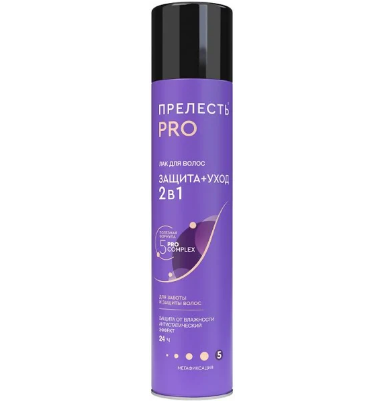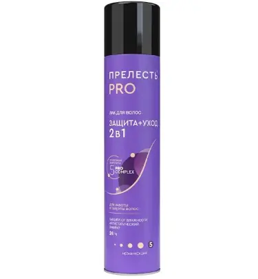 Лак «Защита» оказывает на волосы действительно впечатляющий эффект, делая их блестящими, стойкими к ветру, солнцу, а также упругими и эластичными. Лак содержит комплекс витаминов, растительных экстрактов, природных масел 5Pro Complex и УФ-фильтр. Компоненты комплекса обладают свойствами восстанавливать и защищать структуру волос, помогают предотвратить их механические повреждения, пересушивание, воздействие УФ-излучения. Результат – роскошная и подвижная укладка в любую погоду. Фиксирует волосы на 24 часа без склеивания и утяжеления. Придаёт дополнительный блеск. Подходит для фиксации сложных укладок и ежедневного стайлинга. Обладает антистатическим эффектом. Легко удаляется при расчёсывании.