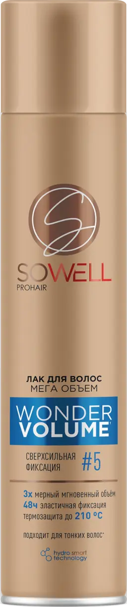 Невесомый лак для волос SoWell «Wonder Volume» Мега объем с усовершенствованной формулой Hydro Smart Technology с легкостью поможет в создании супер объемной укладки, о которой мечтает каждая женщина, и придаст волосам ухоженный вид.