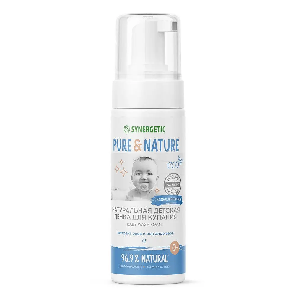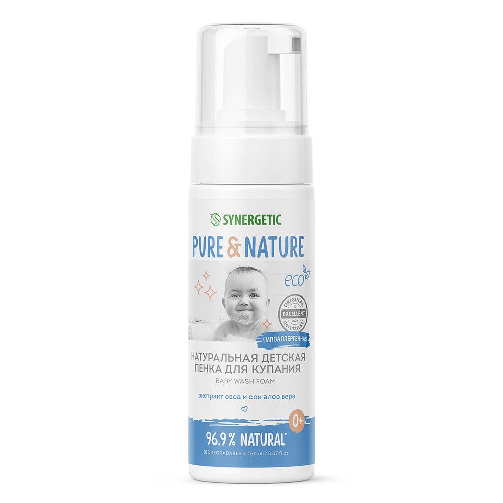 Натуральная гипоаллергенная детская пенка для купания 0+ SYNERGETIC бережно очищает, смягчает и защищает нежную детскую кожу от сухости. Пенка имеет легкую невесомую текстуру, хорошо пенится и легко смывается водой. Безопасная, эффективная и гипоаллергенная формула содержит молочную кислоту и пребиотик трегалозу, которые нормализуют и сохраняют естественный микробиом. Бисаболол успокаивает и помогает восстановить барьерные функции кожи. Экстракт овса – это природный эмолент с выраженными антиоксидантными свойствами, питательный, увлажняющий, защищающий и восстанавливающий естественную среду детской кожи. Сок алоэ вера питает и увлажняет кожу, а масло сладкого миндаля регулирует гидролипидный баланс, предотвращая появление сухости, раздражения и шелушения.