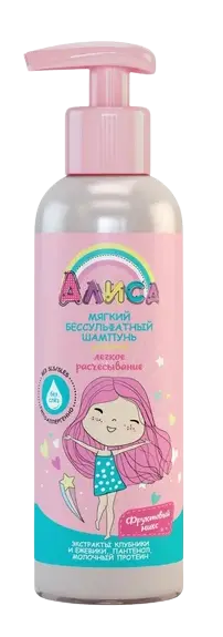 Ваша малышка уже подросла, но ей по-прежнему требуется безопасное средство для бережного очищения волос и кожи головы. Мягкий шампунь «Алиса» не содержит сульфатов, имеет нейтральный уровень рН и не вызывает слез, поэтому подходит даже для самых нежных принцесс. В составе содержатся экстракты клубники и ежевики, пантенол, молочный протеин, благодаря которым волосы станут мягкими, шелковистыми и обретут природный блеск.