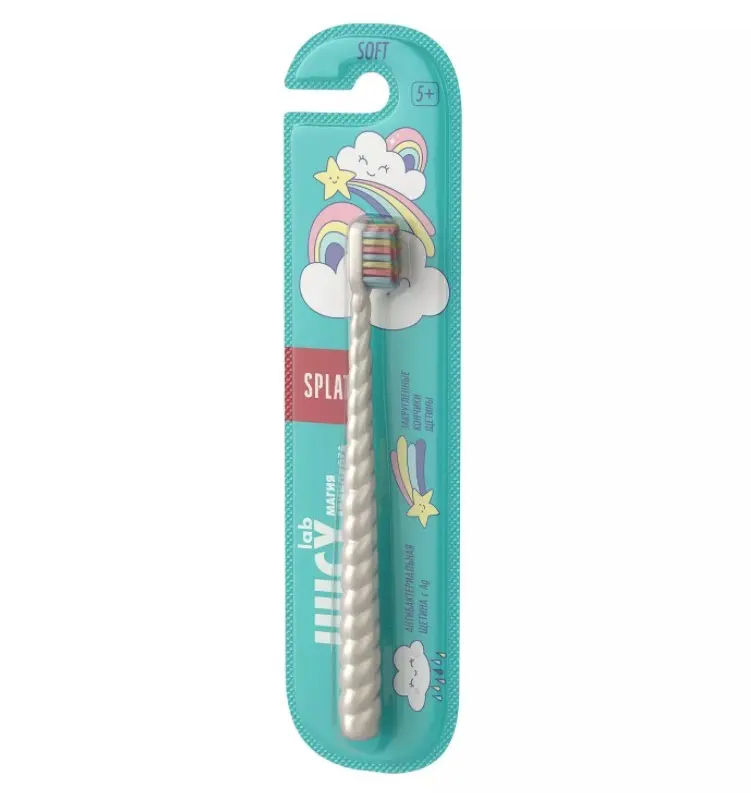 Детская зубная щетка серии Juicy Lab «Магия единорога» с ионами серебра и мягкой щетиной подходит для детей от 5 лет.