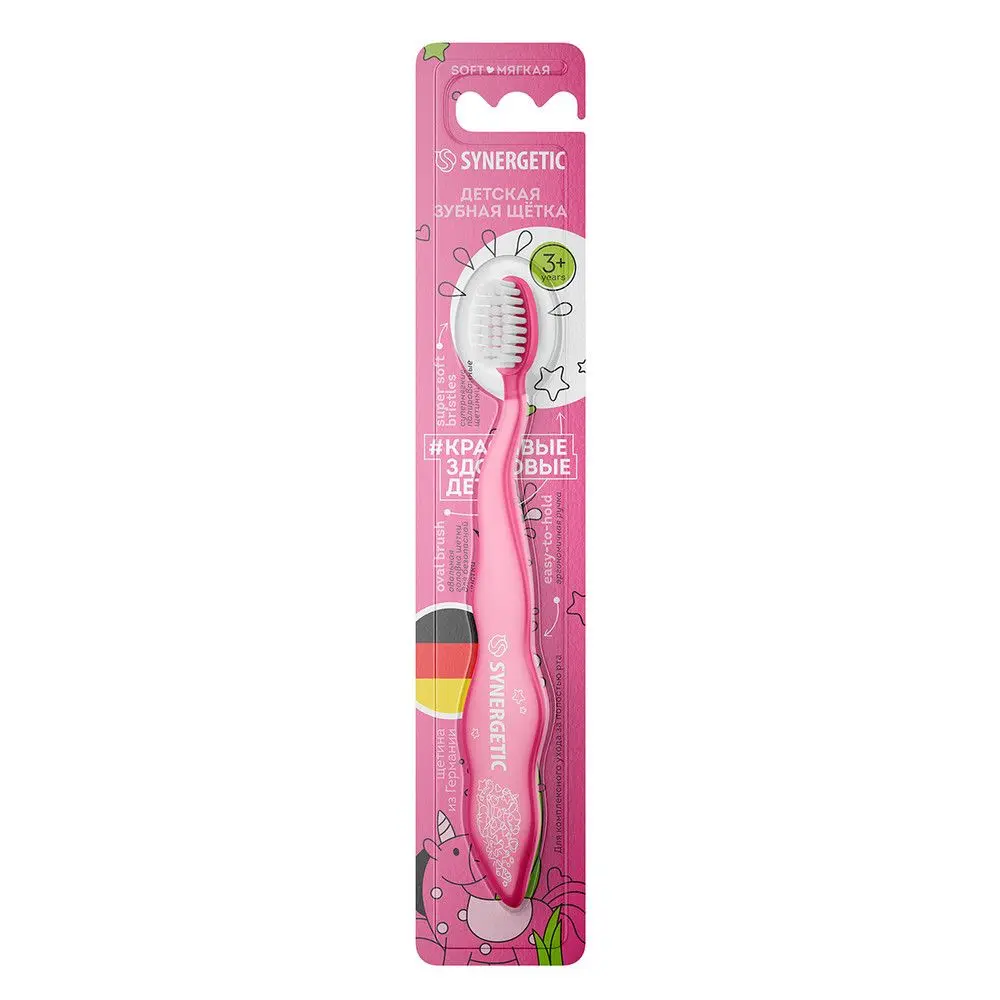 Вся радость жизни умещается в улыбке ребёнка! Детская зубная щётка SYNERGETIC с мягкой щетиной soft разработана с учётом рекомендаций ведущих стоматологов для ежедневного комплексного ухода за полостью рта. Эргономичная ручка из высококачественного и безопасного пластика разработана специально для детских ладошек. Щетка предназначена для детей старше трёх лет. Овальная головка щетки и компактная чистящая поверхность обеспечивают бережное и безопасное очищение нежной детской эмали от налёта и максимальный комфорт при использовании. Супермягкие полированные нейлоновые щетинки толщиной 0,12 мм Dentex® S, которые производит компания Pedex GmbH Perlon® The Filament Company в Германии, эффективно удаляют налёт даже в труднодоступных местах, не повреждая дёсны. Зубные щетки SYNERGETIC одобрены Стоматологической Ассоциацией, что позволяет рекомендовать их использование для эффективного поддержания надлежащего уровня стоматологического здоровья и служит гарантией их потребительских свойств и качеств. Для достижения максимального результата рекомендуется использовать вместе с детскими зубными пастами SYNERGETIC.