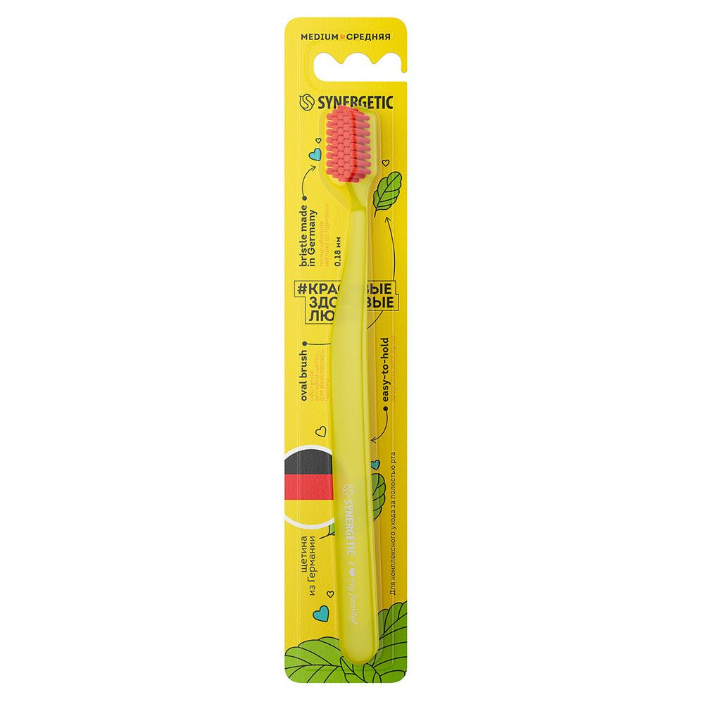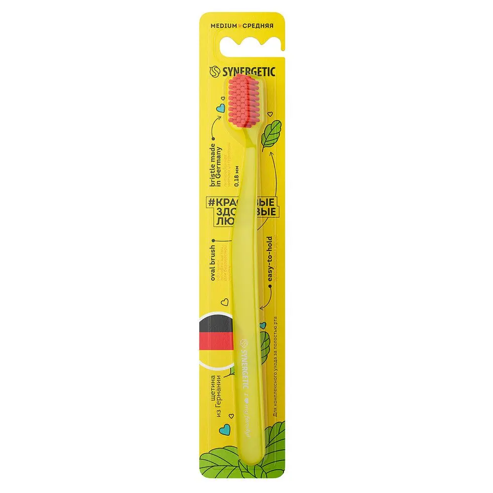 Самый яркий свет в мире – это свет улыбки! Зубная щётка SYNERGETIC желтого цвета со щетиной средней жесткости medium разработана с учетом рекомендаций ведущих стоматологов для эффективного очищения эмали от налёта и ежедневного комплексного ухода за полостью рта. Компактная чистящая поверхность овальной формы обеспечивает максимальный комфорт при использовании щётки. Идеально отполированная щетина 0,18 мм Dentex® S, которая производится в компании Pedex GmbH Perlon® The Filament Company в Германии, эффективно удаляет налёт даже в труднодоступных местах, не повреждая дёсны. Удобная эргономичная ручка из высококачественного пластика комфортно лежит в руке и способствует правильной технике чистки. Для достижения наилучшего результата рекомендуется использовать вместе с зубными пастами SYNERGETIC.