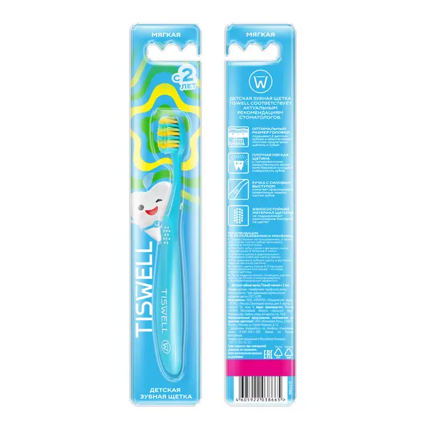 Зубная щетка детская синяя Tiswell — это надежный инструмент для ухода за полостью рта. Зубная щетка для малышей от 2 лет Tiswell понравится вам и вашему ребенку. Детская зубная щетка от 2 лет разработана в соответствии с актуальными рекомендациями стоматологов. Щетка зубная детская Tiswell бережно очищает поверхность зубов за счет плотной и мягкой щетки с полированными закругленными наконечниками. Оптимальный размер головки закрывает 2 детских зубика и обеспечивает плотное прилегание щетины к зубам. Зубная щетка детская от 2 лет создана для бережного ухода за полостью рта. Зубная щётка детская синяя Tiswell помогает малышам повышать навыки чистки зубов за ручки с силовым выступом. Щетка детская для чистки зубов изготовлена из специального прочного материала, который не поддерживает размножение ошибок°. Синяя мягкая зубная щетка для детей Tiswell представляет собой идеальное сочетание простоты использования, качества и доступности. Зубная щетка для малышей Tiswell подходит детям от 2 лет.