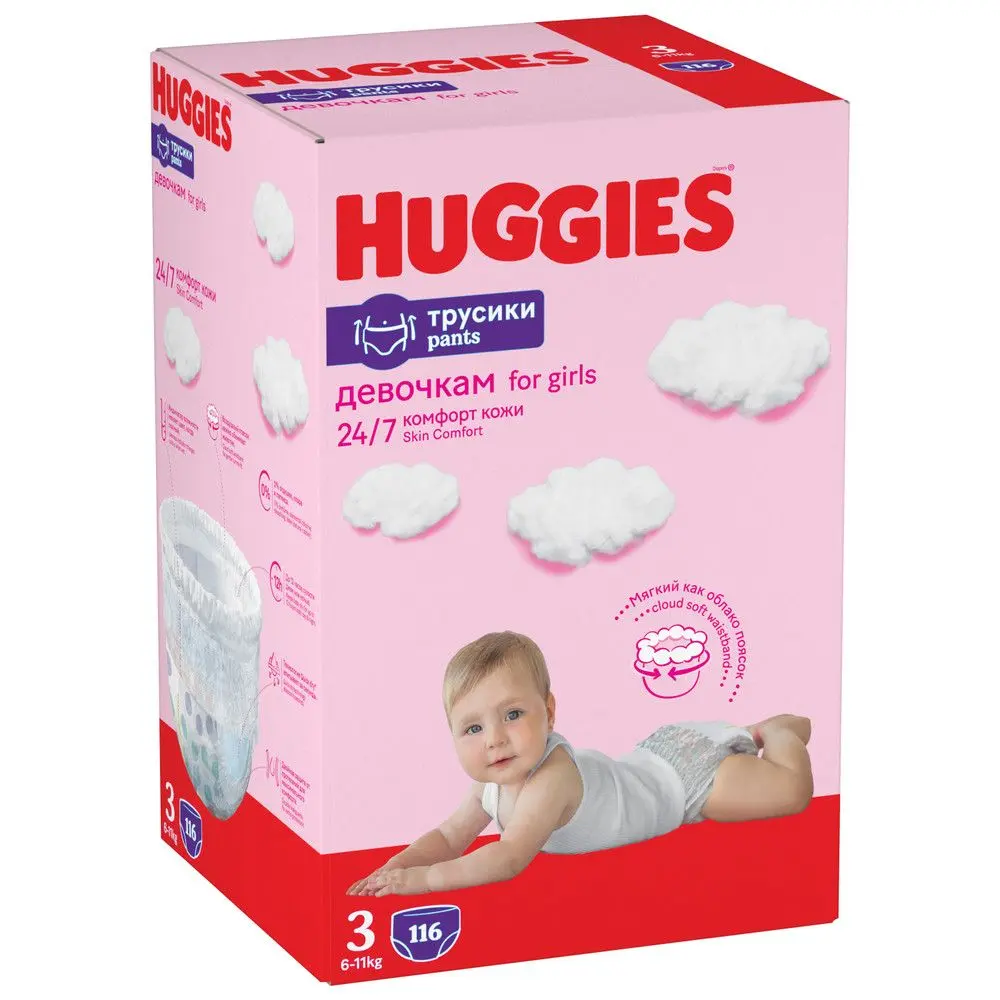 Подгузники трусики Huggies, созданные специально для наших маленьких принцесс! Размер 3, подходит для девочек весом от 6 до 11 кг. Новая коллекция подгузников-трусиков Huggies для девочек порадует вас свежими героями. Специально разработанный поясок с липучкой-утилизатором адаптируется к изменяющимся размерам животика малышки. Дополнительный слой на пояске создает меньшее давление на животик и обеспечивает дополнительный комфорт. Подгузники трусики Хаггис 3 сделаны из высококачественных азиатских материалов и с использованием передовых технологий. Детские подгузники Huggies для девочек не содержат отдушек, хлора и латекса, что делает подгузники мягкими и гипоаллергенными. Впитывающий слой DryTouch, расположенный с учетом анатомических особенностей девочек (смещен к центру), обеспечивает надежную защиту и комфорт для ребенка. У подгузников трусиков Хаггис мягкие эластичные резиночки вокруг ножек, которые создают дополнительную защиту от протекания даже в самые активные моменты. С детскими подгузниками-трусиками Huggies девочка будет чувствовать себя уверенно и защищено каждый день. В упаковке содержится 116 штук подгузников, что обеспечит вам достаточное количество на длительное время.