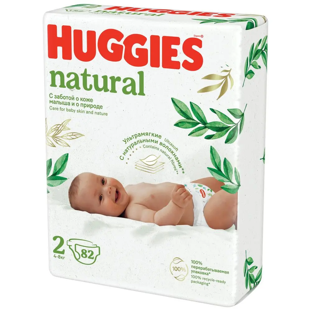Подгузники Huggies Natural для новорожденных детей весом 4-8 кг 2 размер 82 шт, созданы чтобы обеспечить комфорт и защиту для малыша на каждом шагу его развития. Как заботливый родитель, вы всегда хотите дать своему малышу только самое лучшее, поэтому выбор Хаггис Natural будет правильным и осознанным решением. Эко подгузники Хаггис Нэчурал — это ультрамягкие и ультратонкие подгузники. Huggies Natural созданы из натуральных материалов для обеспечения нежного прикосновения к коже вашего ребенка. Каждый слой детского подгузника менее 5мм для быстрого впитывания и сокращения вероятности протекания. Во-вторых, Huggies Natural имеют дышащие материалы с микроскопическими порами, которые позволяют коже младенца дышать. Для такой маленькой и нежной кожи важно, чтобы воздух свободно циркулировал, и Huggies Natural в полной мере обеспечивают это. У подгузников Huggies Natural 100% перерабатываемая упаковка делает их еще более привлекательными для тех, кто заботится об окружающей среде. У Хаггис Natural также есть индикатор влаги, который меняет цвет, когда подгузник полон. Это помогает вам контролировать количество мочи и вовремя менять подгузник, чтобы избежать дискомфорта для вашего малыша и поддерживать его сухость и комфорт. Подгузник Huggies Natural размера 2 создан специально для младенцев весом от 4 до 8 кг. Подгузники Хаггис Natural подходят для мальчиков и девочек. В каждой упаковке содержится 82 штуки, что будет достаточно для длительного использования.