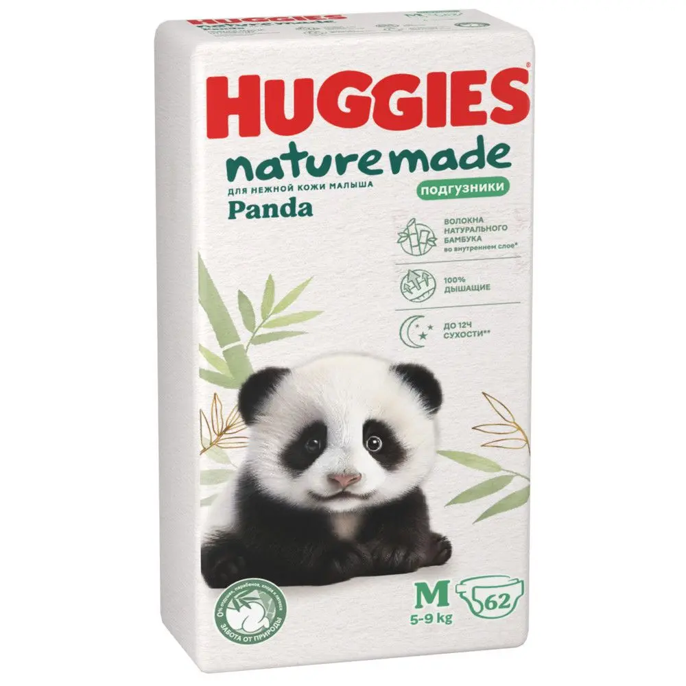 Инновационные подгузники Huggies Naturemade Panda с волокнами натурального бамбука – забота от природы для нежной кожи малыша. Подгузники для детей размер 3/M подойдут ребенку весом 5-9 кг. Внутренний слой с волокнами натурального бамбука не натирает и не раздражает кожу. «Чистый» состав без парабенов, отдушек, хлора и латекса подойдет для самой нежной кожи. Ультрамягкие, как объятия панды, материалы, нежно обнимают животик, даря комфорт и спокойствие, как в маминых объятиях. Тонкие, oдноразовые подгузники Huggies Panda M удерживают до 99% жидкости, обеспечивая до 12 часов сухости днем и ночью и помогая предотвращать появление раздражений. Мягкий внешний слой с 4000 микропор обеспечивает циркуляцию воздуха, помогает коже дышать и предотвращает появление «парникового эффекта». Невероятно мягкий задний кармашек надежно защищает от протеканий по спинке. Тянущиеся ушки обеспечат надежное прилегание подгузников без давления на животик. Индикатор влаги подскажет, когда пора менять подгузник. Подгузники Хаггис Панда размера 3 – мягкие, как объятия панды, и заботливые, как мама.