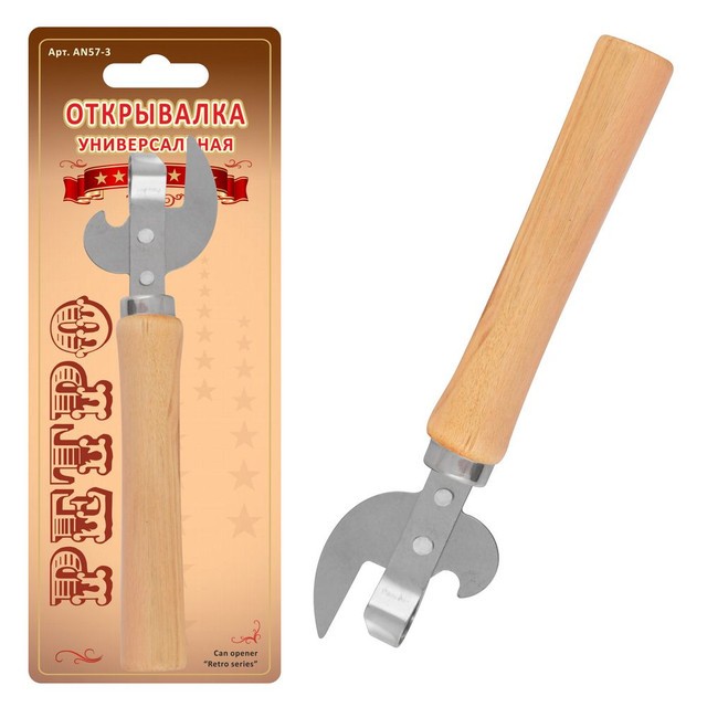 Модель универсальной открывалки знакома всем с детства. Кухонная классика в ретро-концепции станет незаменимым помощником для открывания консервных банок и бутылок. Приспособление не имеет сложных механизмов, его практически невозможно сломать или повредить. Преимущество модели в наличии штопора, который складывается и убирается в специальный отсек. Пользоваться изделием просто: приготовьте банку и поставьте ее на стол возьмите открывалку и поставьте острым концом на край крышки одной рукой держ