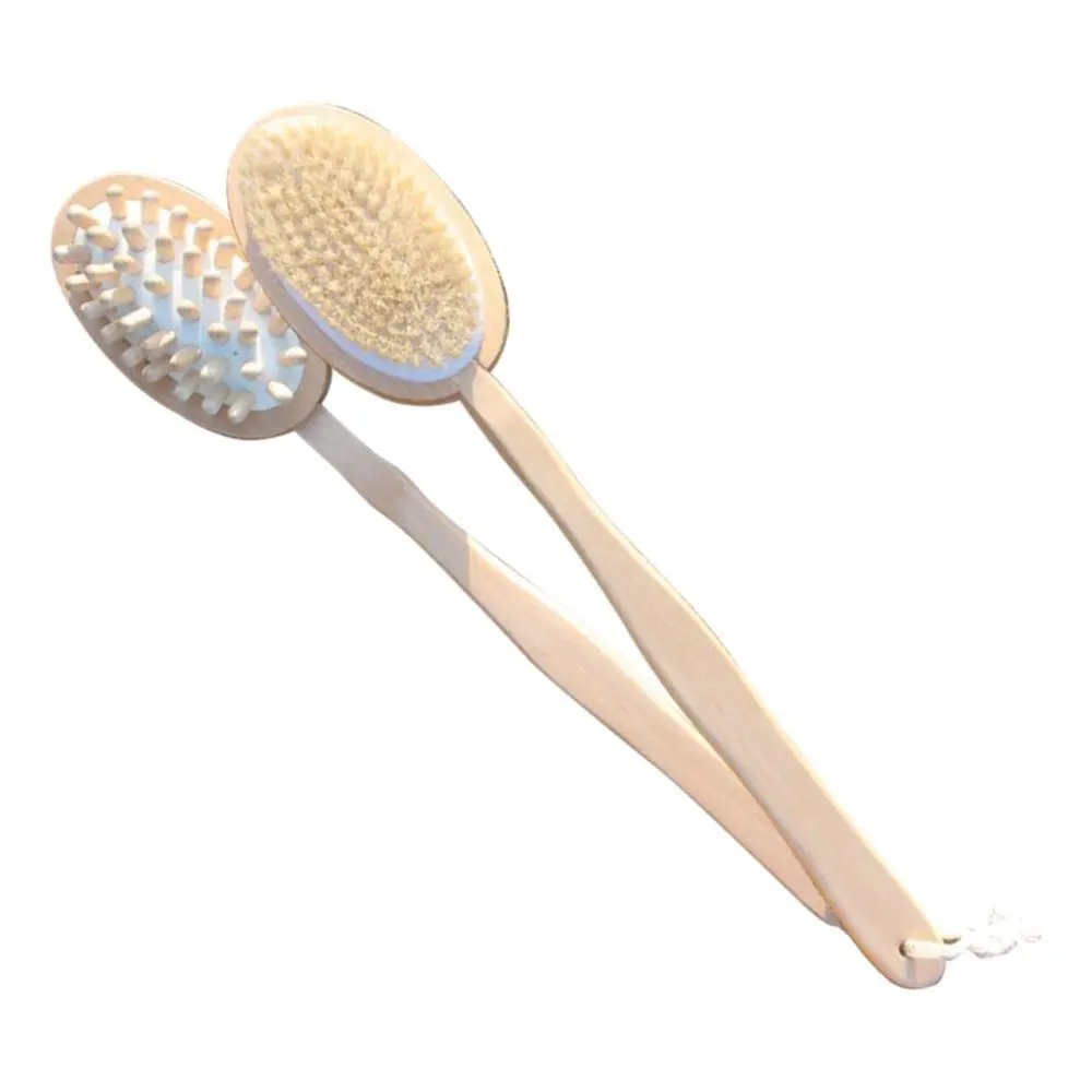 Двухсторонняя щетка для тела с массажными пальцами на резиновой подушке и натуральной щетиной. Обладает активным отшелушивающим и массажным эффектом, улучшает кровообращение и повышает упругость кожи. Эффективна в профилактике и борьбе с целлюлитом, растяжками и рубцами. Ежедневное использование щетки позволяет расслабиться после тяжелого дня и значительно улучшить внешний вид и цвет кожи. Натуральные материалы предохраняют от раздражения. Длинная ручка увеличивает комфорт использования.