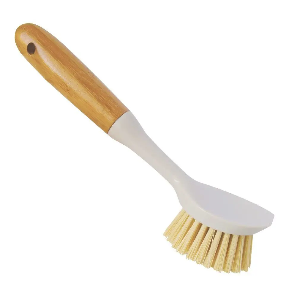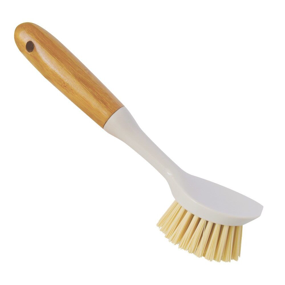Щетка для мытья посуды с бамбуковой ручкой. Предназначена для мытья посуды и кухонной утвари из любых материалов. Удобная эргономичная ручка из бамбука не впитывает влагу, не гниет, не накапливает неприятных запахов. Щетина ПЭТ очень деликатна и одновременно эффективна при очистке засохших загрязнений и пригоревших остатков пищи. Скребок на конце щетки предназначен для борьбы с самыми стойкими загрязнениями. Современный ЭКО дизайн щетки позволяет ей вписаться в любой интерьер кухни. Пластиковые части щетки на 15% состоят из вторично-переработанного пластика, ручка – на 100% из натурального, быстро возобновляемого сырья – бамбука. Все пластмассовые элементы полностью подлежат вторичной переработки.