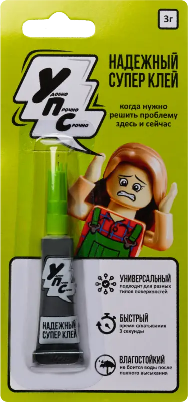 Супер клей УПС надёжно склеивает изделия из различных материалов в любом сочетании: пластмасса, кожа, металл, резина, дерево, керамика, пробка, фарфор.