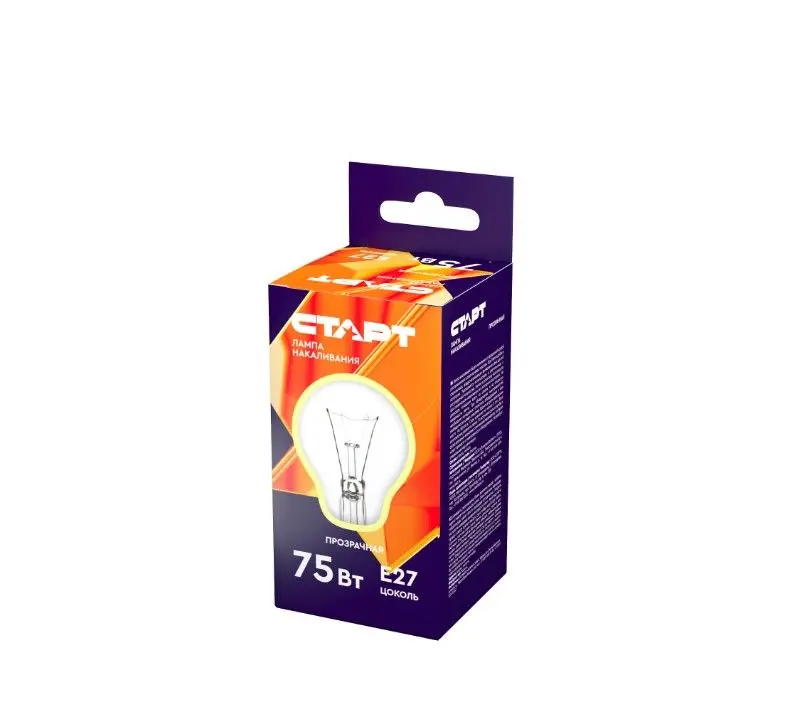 Лампа накаливания. Индивидуальная упаковка из картона. Колба - груша прозрачная. Мощность 75 Вт. Цоколь Е27.