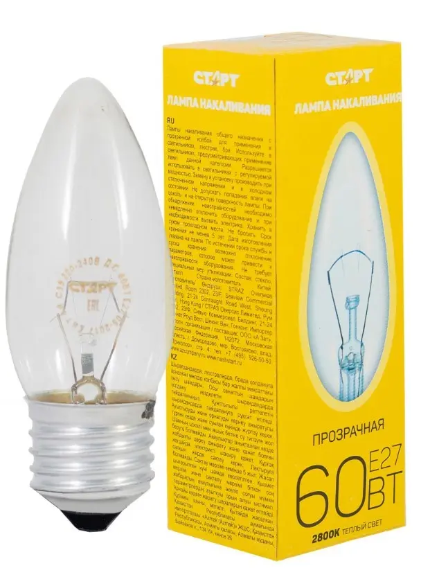 Лампа «СТАРТ» ДС 60 Вт Е27, оснащенная прозрачной колбой типа «свеча» и резьбовым цоколем, относится к прозрачным моделям с нитью накаливания. Устанавливается в осветительных приборах (открытых люстрах, бра, торшерах, светильниках) для излучения яркого дневного света.Прибор относится к классическим источникам света, которые обеспечивают мощность светового потока около 10 Лм/Вт.Увеличить срок службы лампы, например, для организации дежурного освещения, можно за счёт понижения в два раза напряжения. При этом срок эксплуатации увеличивается в 1000 раз.Образование искусственного света происходит за счет накаливания электричеством до 2500°С тугоплавкой вольфрамовой нити длиной 1 м, скрученной в виде спирали. Чтобы уберечь лампу от воздействия воздуха, колбу заполняют смесью инертных газов.Лампа оснащена самым надёжным и простым резьбовым цоколем Е27, который обеспечивает надёжное соединение с патроном.