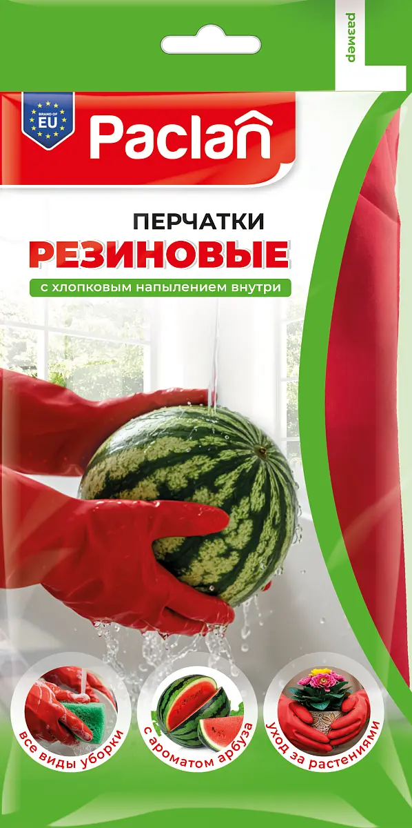 Перчатки Paclan с ароматом арбуза прекрасно подходят для защиты рук при выполнении хозяйственных работ по дому.