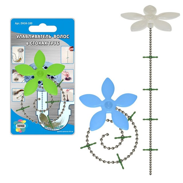 Улавливатель волос – современное и эффективное устройство для предотвращения засоров в трубах. Пользоваться приспособлением очень просто: опустите цепочку в сливное отверстие, а пластмассовую верхушку оставьте снаружи.
