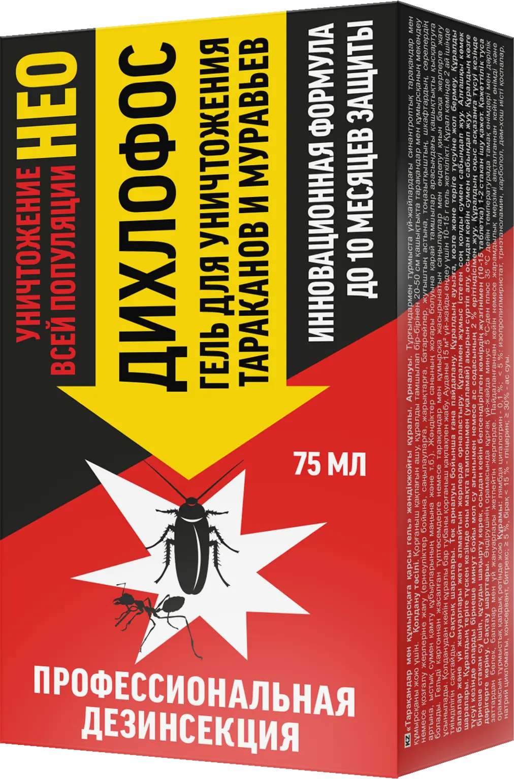 Дихлофос НЕО - гель для уничтожения тараканов и муравьёв 75 мл предназначен для уничтожения ползающих насекомых (тараканов и муравьев), обеспечивает защитный барьер до 2 месяцев.Действие 2 в 1: защита от тараканов и муравьёвДлительный эффект: до 2-х месяцев защиты после обработкиЭкономичное использование: 1 тубы хватает на 5 обработок помещенияУдобное использование: удлиненный носик позволяет наносить средство в труднодоступные местаПрофессиональная дезинсекция: не оставляет следов на поверхности.