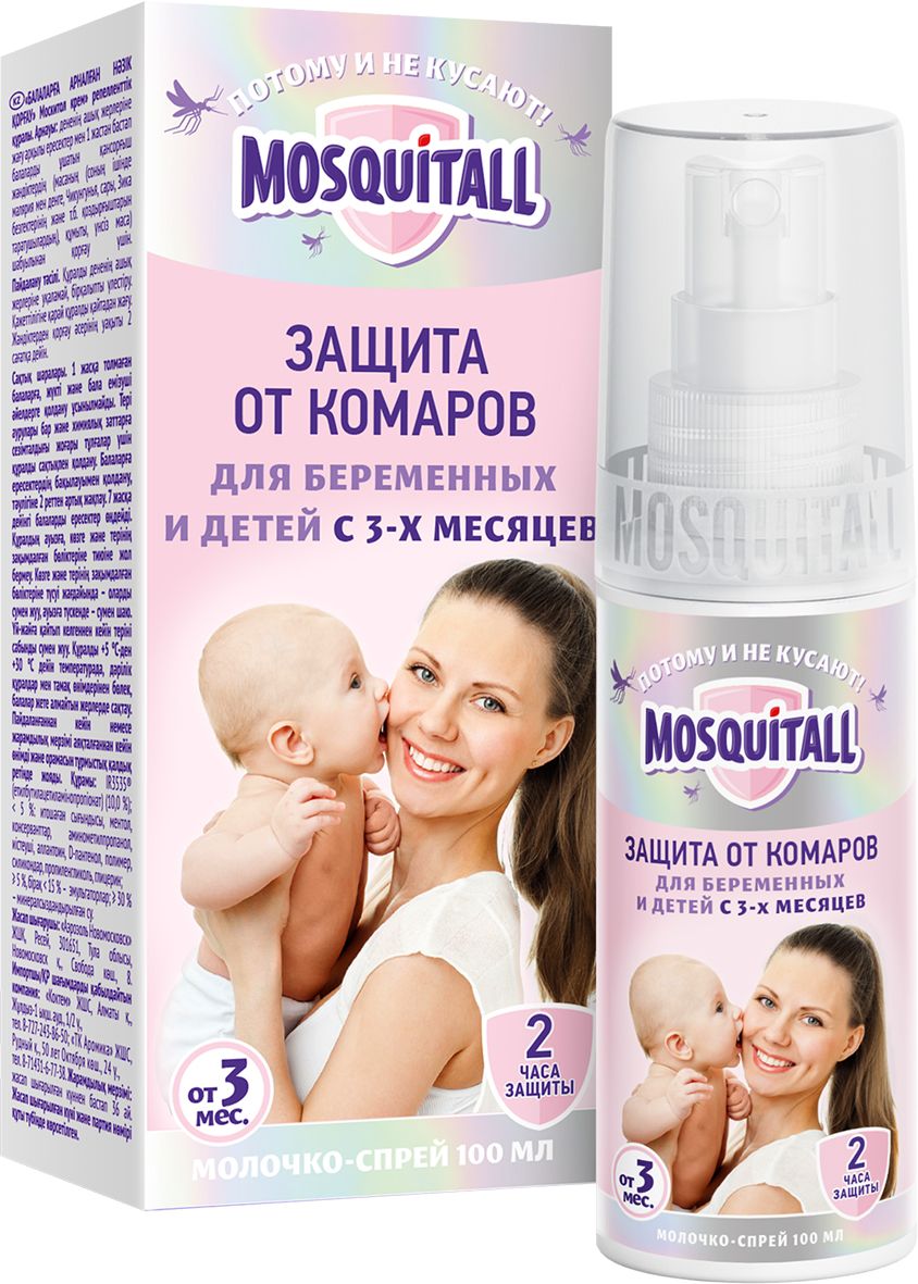 Молочко-спрей от комаров Mosquitall "Нежная защита для младенцев от 3 мес. и беременных" 100 мл - УНИКАЛЬНЫЙ продукт, подходит для младенцев от 3-х месяцев и беременным женщинам. Молочко-спрей надежно защитит Вашего малыша от укусов комаров, мошек, мокрецов и москитов во время прогулок. В состав средства входит IR3535 10% – действующее вещество нового поколения, самый безопасный из существующих репеллентов. Он является производным природной аминокислоты b-аланина и относится к БИО-репеллентам, не обладает запахом и не оставляет ощущения липкости на коже. Молочко-спрей 2 в 1 не только эффективно отпугивает комаров, но смягчает и увлажняет нежную кожу ребенка, а также снимает неприятные ощущения и зуд после укусов, способствует исчезновению покраснений, вызванных укусами насекомых. Входящие в состав: - ПАНТЕНОЛ – увлажняет кожу; - АЛЛАНТОИН – способствует регенерации кожи; - МЕНТОЛ - снимает раздражение и зуд. • Время защитного действия: до 2 часов • Разрешено к применению для детей от 3-х месяцев и для беременных женщин • Незаменимо для людей с особо чувствительной кожей • Без парабенов • Не оставляет следов на одежде; • Обладает приятным нежным ароматом
