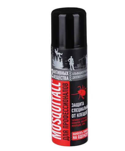 Акарицидно-репеллентное средство для обработки одежды для защиты от клещей. Аэрозоль защищает от иксодовых клещей, комаров, мокрецов, москитов, блох в местах особой активности насекомых. Оказывает двойное действие: убивает лесных и таежных клещей; отпугивает комаров. Средство на спиртовой основе: быстро высыхает и не оставляет следов на одежде и снаряжении