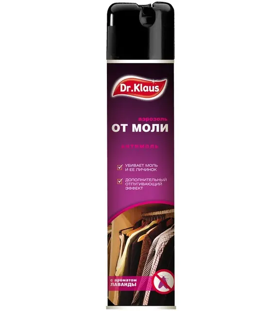 Эффективен против моли, её личинок и кожееда. Уничтожает личинок, а не просто отпугивает моль. Главной фактором порчи мебели и вещей является не взрослая особь, а именно гусеница моли. Мгновенная защита вещей до 6 месяцев. Удобная обработка одежды, обуви, головных уборов. Длительность защиты до 6 месяцев. Dr.Klaus эффективно и безопасно защищает ваши вещи от моли до следующего сезона. Достаточно обработать одежду, обувь и головные уборы перед хранением и проветрить комнату. Для лучшего эффекта рекомендуется также обработать и сами места хранения – шкафы, коробки, ящики.