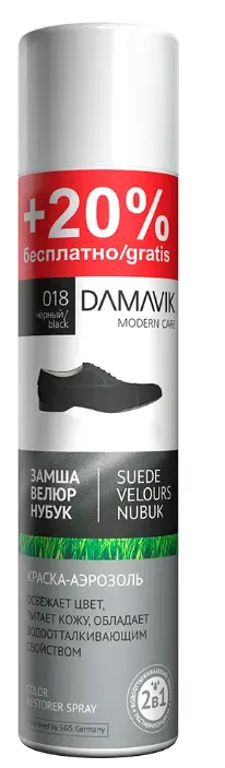 Краска-аэрозоль «DAMAVIK» для замши, нубука, велюра освежает цвет и питает кожу всех изделий из замши, велюра и нубука. Обладает водоотталкивающим свойством. Не предназначена для перекрашивания изделия в другой цвет. Для устойчивости цвета рекомендуется применять регулярно.