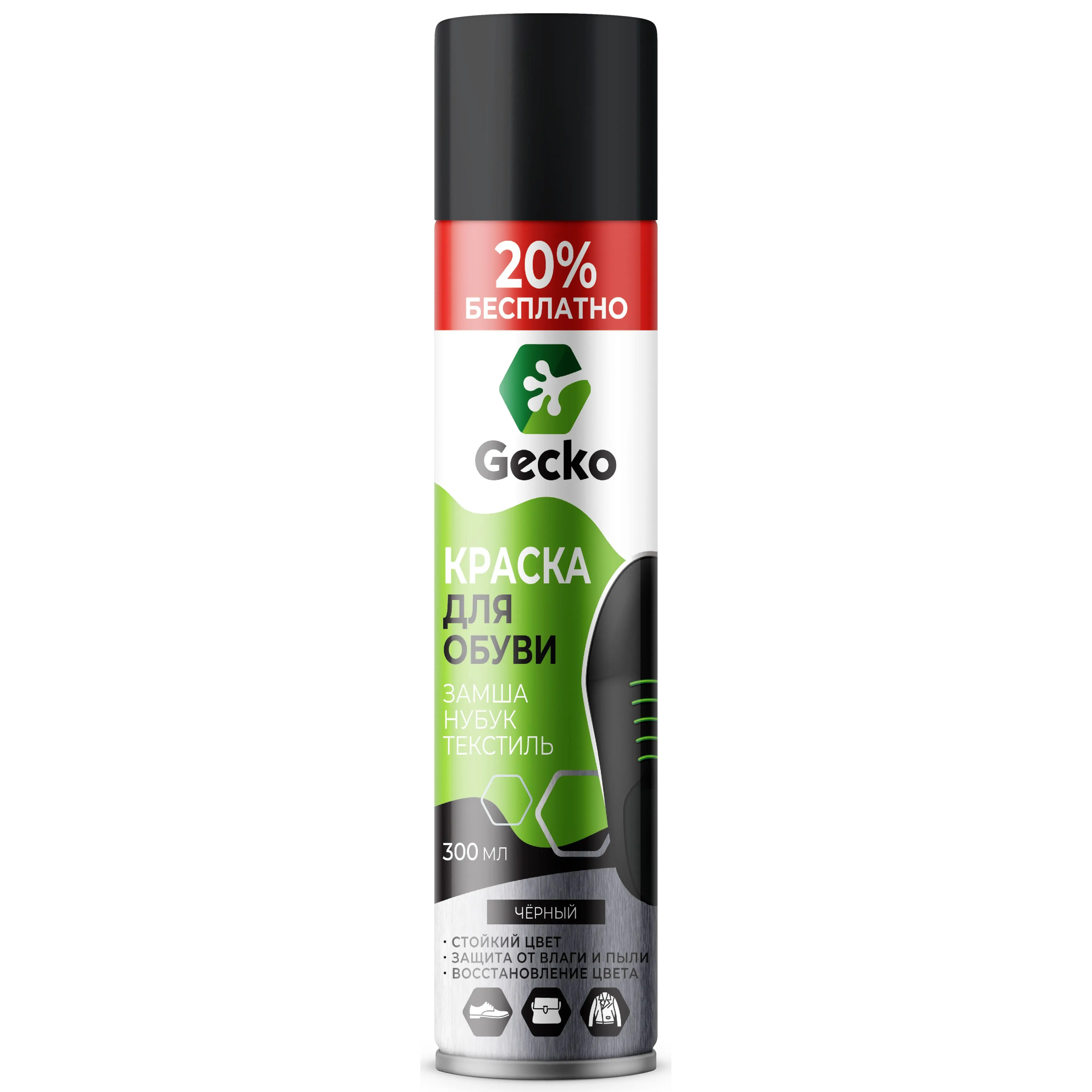 Аэрозоль-краска для обуви из замши, велюра, нубука и текстиля GECKO (ТМ НОМЕХ) - предназначена для окрашивания обуви и любых других изделий из замши, нубука, велюра и текстиля в черный цвет, а также для их защиты от воды, снега, пыли, грязи, солевых реагентов и других негативных воздействий.