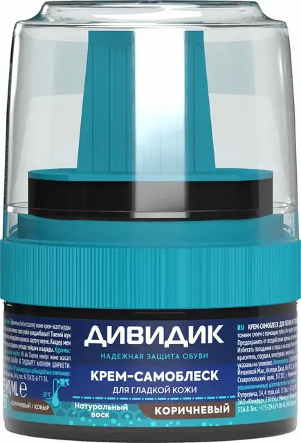 Крем самоблеск для обуви Дивидик защищает от пыли, влаги и соли, ухаживает за обувью, обновляя ее цвет и смягчая кожу.